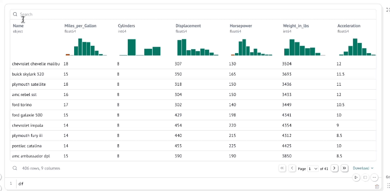 **交互式 dataframe。** [浏览、搜索、筛选和排序](https://docs.marimo.io/guides/working_with_data/dataframes.html) 数百万行数据,速度极快,无需编写代码。
