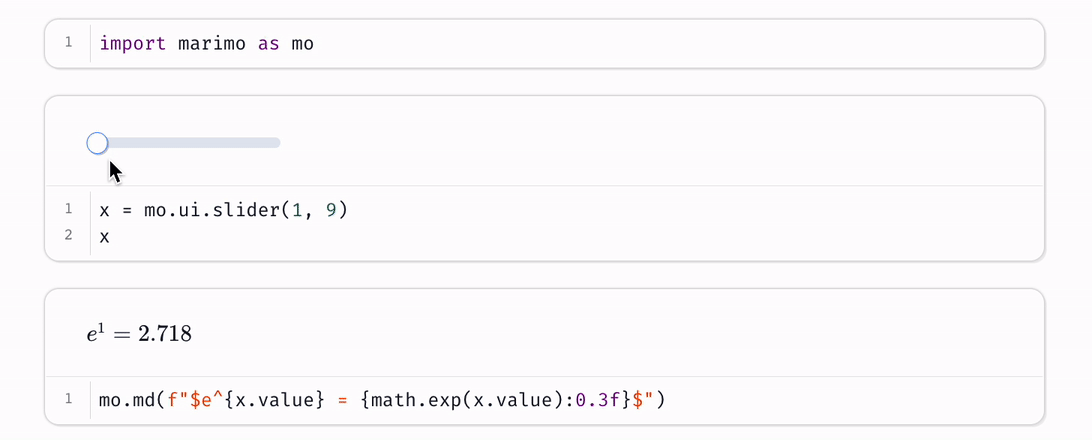 **同步的 UI 元素。** 与 [UI 元素](https://docs.marimo.io/guides/interactivity.html)(如 [滑块](https://docs.marimo.io/api/inputs/slider.html#slider)、[下拉菜单](https://docs.marimo.io/api/inputs/dropdown.html)、[dataframe 转换器](https://docs.marimo.io/api/inputs/dataframe.html) 和 [聊天界面](https://docs.marimo.io/api/inputs/chat.html))交互,使用它们的单元格会自动使用最新值重新运行。