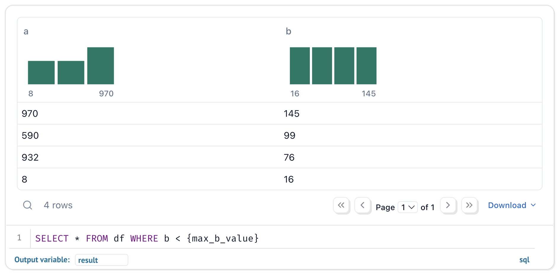 **使用 SQL 查询数据。** 构建依赖 Python 值的 [SQL](https://docs.marimo.io/guides/working_with_data/sql.html) 查询,并使用我们内置的 SQL 引擎将其针对 dataframe、数据库、湖仓、CSV、Google Sheets 或任何其他数据源执行,该引擎将结果作为 Python dataframe 返回。