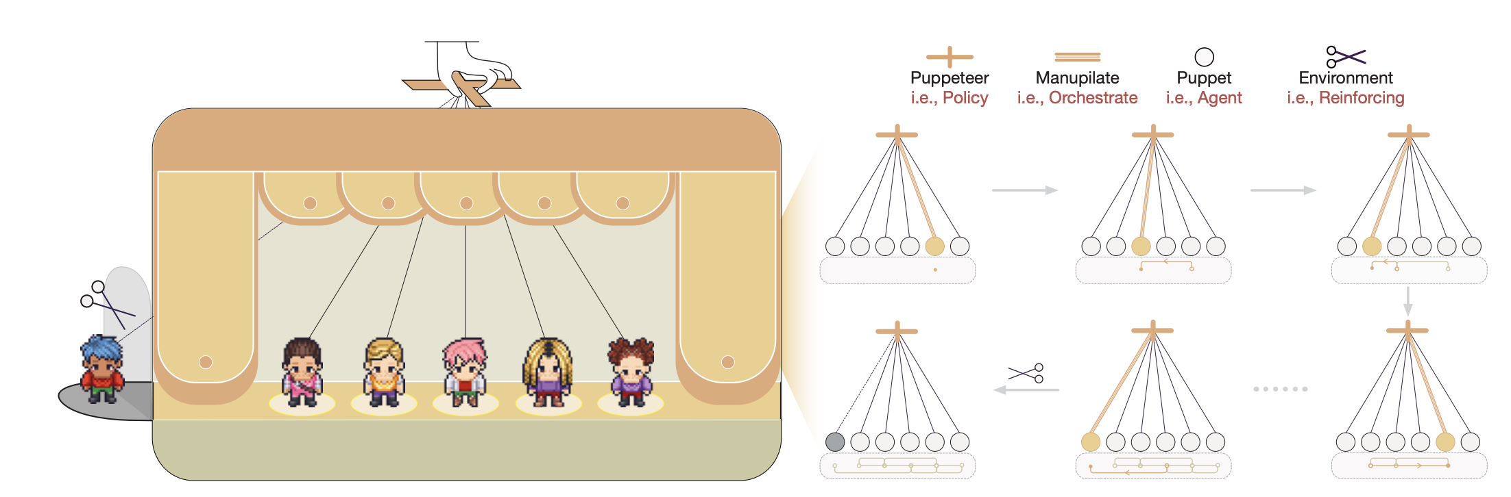 •2025年9月24日:🎉 我们的论文 [Multi-Agent Collaboration via Evolving Orchestration](https://arxiv.org/abs/2505.19591) 已被 NeurIPS 2025 录用。其实现位于本仓库的 `puppeteer` 分支中。 •2025年5月26日:🎉 我们提出了一种新的傀儡师风格范式,用于基于大型语言模型的 Agent 之间的多智能体协作。通过利用经强化学习优化的可学习中央编排器,我们的方法动态地激活和排序 Agent,以构建高效、上下文感知的推理路径。这种方法不仅提高了推理质量,还降低了计算成本,从而在复杂任务中实现可扩展且适应性强的多智能体合作。 请参阅我们的论文 [Multi-Agent Collaboration via Evolving Orchestration](https://arxiv.org/abs/2505.19591)。