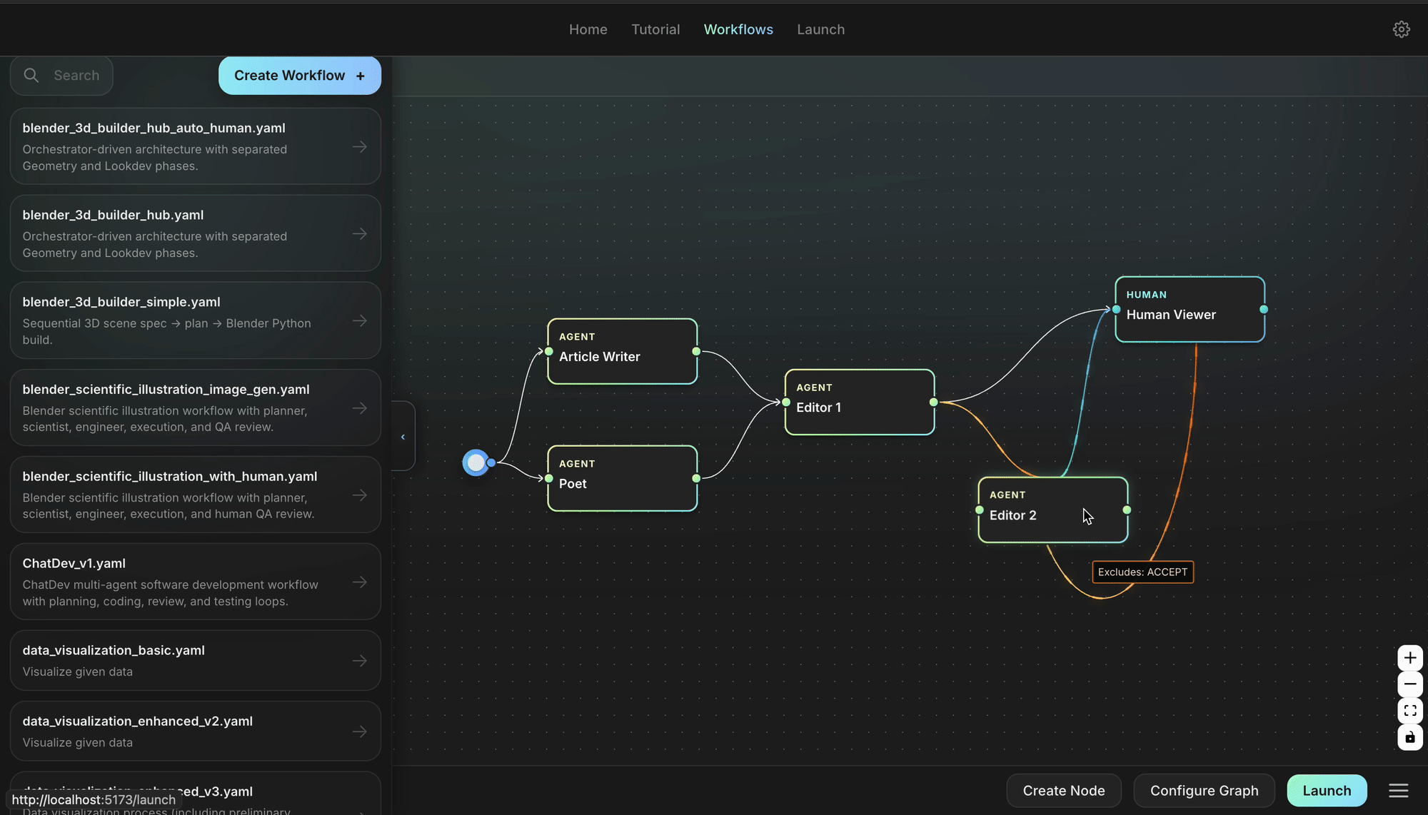 * **工作流**: 一个用于设计多智能体系统的可视化画布。配置节点参数、定义上下文流,并通过拖拽轻松编排复杂的 Agent 交互。