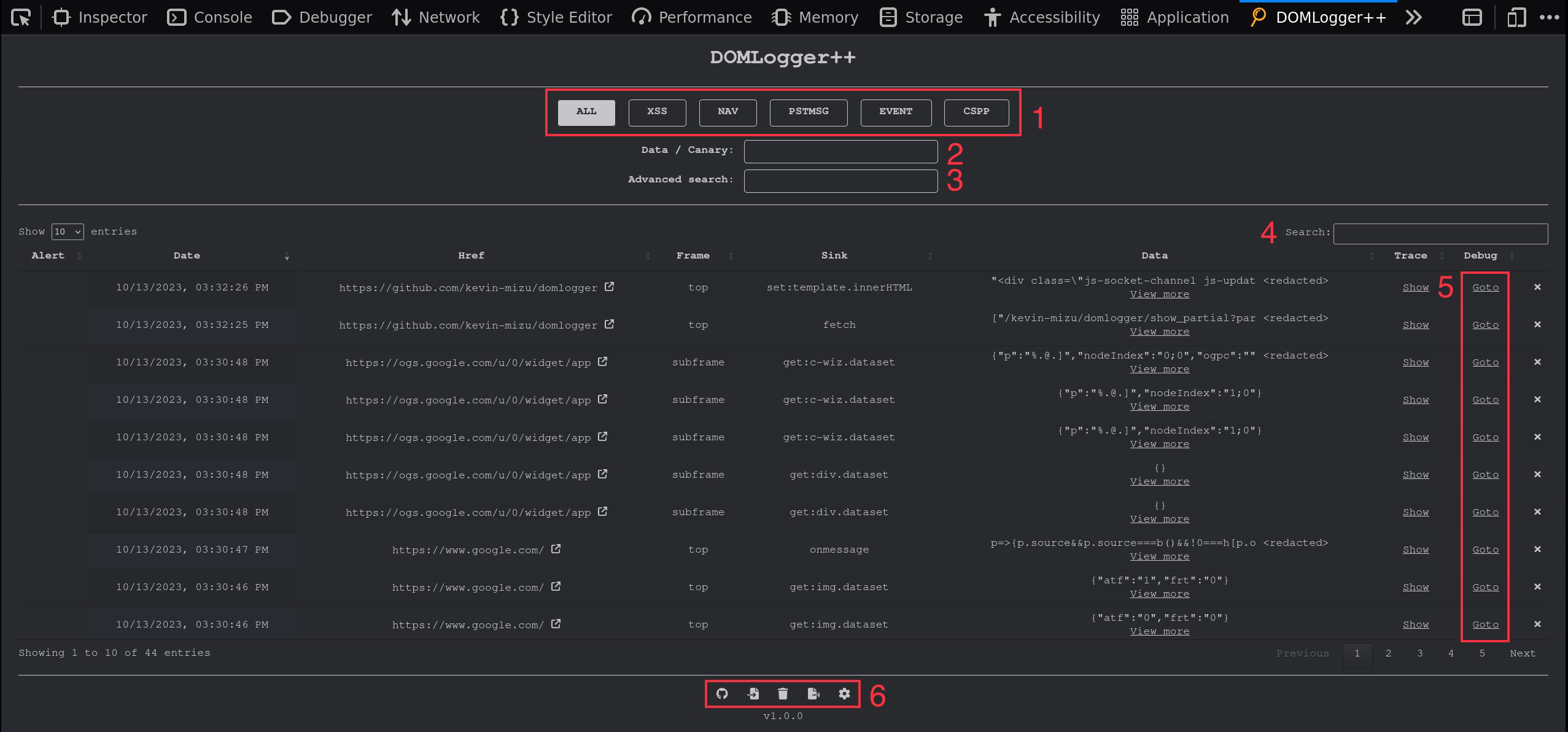## 🛠️ Devtools  1. `Custom filter buttons`(自定义过滤按钮):根据您的自定义设置动态生成,这些按钮有助于日志过滤。 2. `Data/Canary search bar`(数据/Canary 搜索栏):使用与 Sink 参数数据相关的特定条件,轻松过滤和高亮日志。 3. `Advanced column search`(高级列搜索):根据特定的列条件(例如 `sink=innerHTML;frame=top`)定制搜索,以获得更精确的结果。 4. `Global search bar`(全局搜索栏):此默认数据表功能允许在所有列中进行搜索。 5. `Debug button`(调试按钮):直接导航到触发 Sink 的页面,并自动设置断点以便调试。 6. `Log data management buttons`(日志数据管理按钮): - 导入 JSON 日志数据。 - 清除现有日志数据。 - 导出 JSON 格式的日志数据。