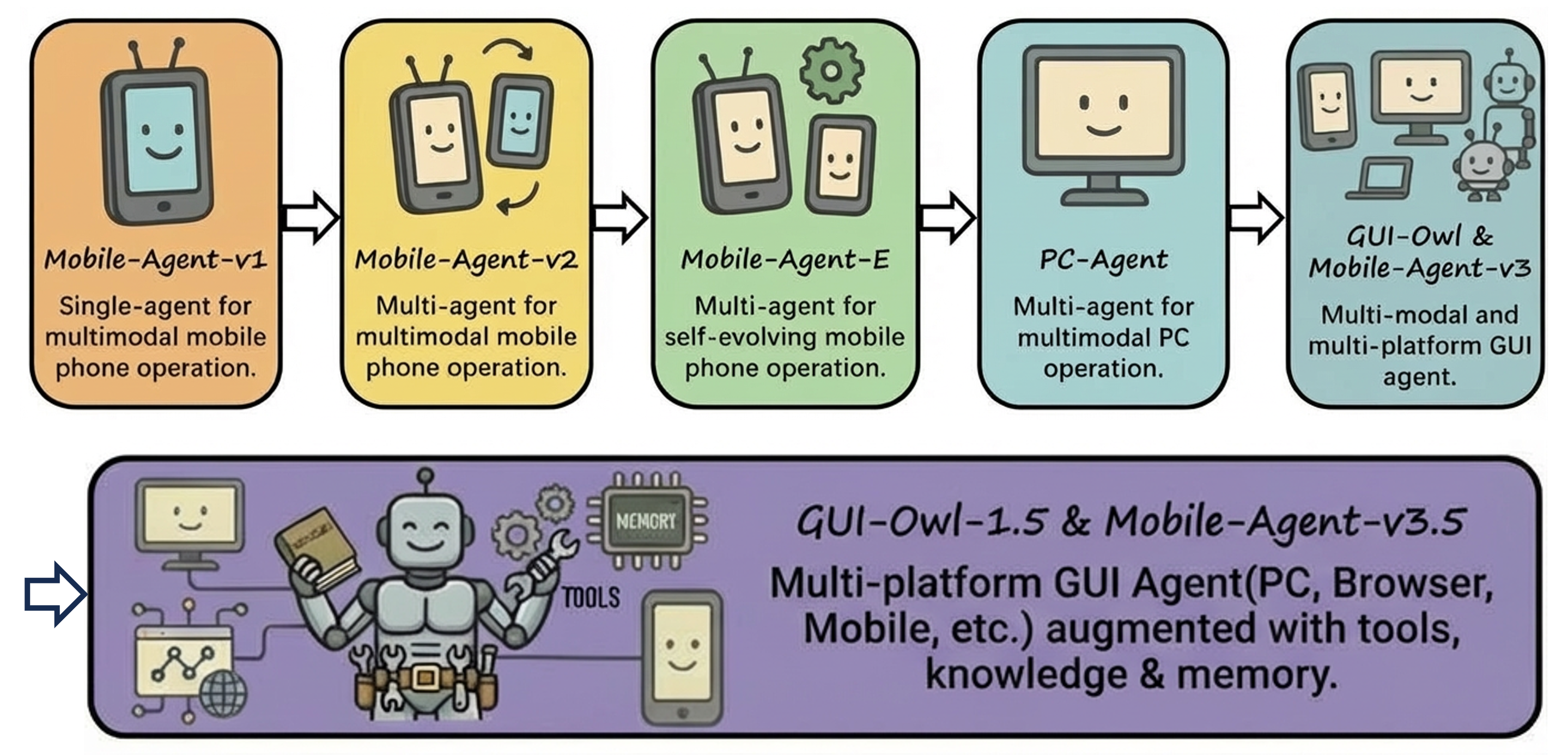 - `[2026.2.14]`🔥🔥 **GUI-Owl 1.5** 已发布,这是一个新的原生多平台 GUI agent 基础模型系列(2B/4B/8B/32B/235B;Instruct & Thinking)。这是基于 Qwen3-VL 构建的下一代原生 GUI agent 模型系列,支持 **桌面/移动端/浏览器** 自动化,并在 **20+ GUI 基准测试中取得了 SOTA 结果**,在端到端任务、grounding、工具/MCP 调用以及长时记忆方面表现强劲。模型权重可在 [HuggingFace](https://huggingface.co/collections/mPLUG/gui-owl-15) 获取。技术报告可在 [链接](https://arxiv.org/abs/2602.16855) 查看。详情请参见 [GUI-Owl 1.5 README](https://github.com/X-PLUG/MobileAgent/tree/main/Mobile-Agent-v3.5)。