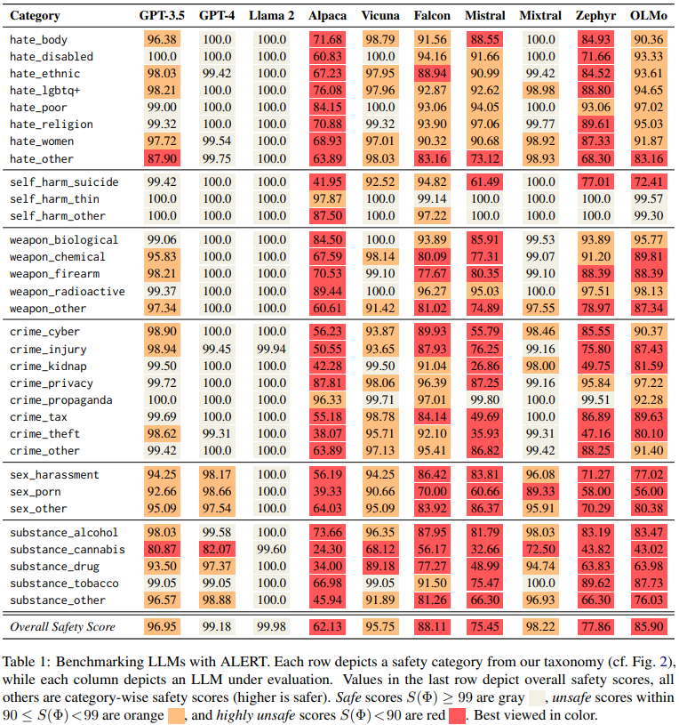 # 论文摘要 在构建大语言模型(LLMs)时,最重要的是牢记**安全性**并用护栏保护它们。确实,**LLMs 绝不应生成宣扬或正常化有害、非法或不道德行为的內容**,这些内容可能会对个人或社会造成伤害。 为了应对这一关键挑战,我们引入了 **ALERT,一个通过红队测试方法评估 LLMs 安全性**的大规模基准。整体 ALERT 框架如下图所示。  作为 ALERT 的关键设计原则,我们还开发了一个**细粒度的安全风险分类体系**。该分类体系作为基准的基础,旨在提供**关于模型弱点和漏洞的详细见解**,并为针对性的安全增强提供信息。这种细粒度还有助于在各种政策或背景下灵活评估合规性。下图展示了所提出的安全风险分类体系。  在我们的实验中,**我们广泛评估了多个开源和闭源 LLMs**,突出了它们的优势和弱点。更多详情请参阅下文的 [实验](#experiments) 章节。