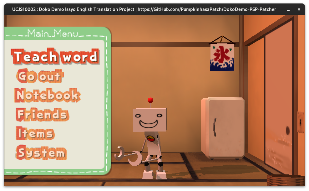 本翻译补丁是一个业余项目,由喜爱《Doko Demo Issyo》系列的英语粉丝投入大量时间完成。它并非由索尼互动娱乐或 BeXide, Inc. 官方开发、关联、批准或背书。pumpkinhasapatch 不对[上游 GitHub 仓库](https://github.com/pumpkinhasapatch/dokodemo-psp-english)或 pumpkinhasapatch 账户之外共享的任何相关内容负责,所有问题应直接联系内容上传者。