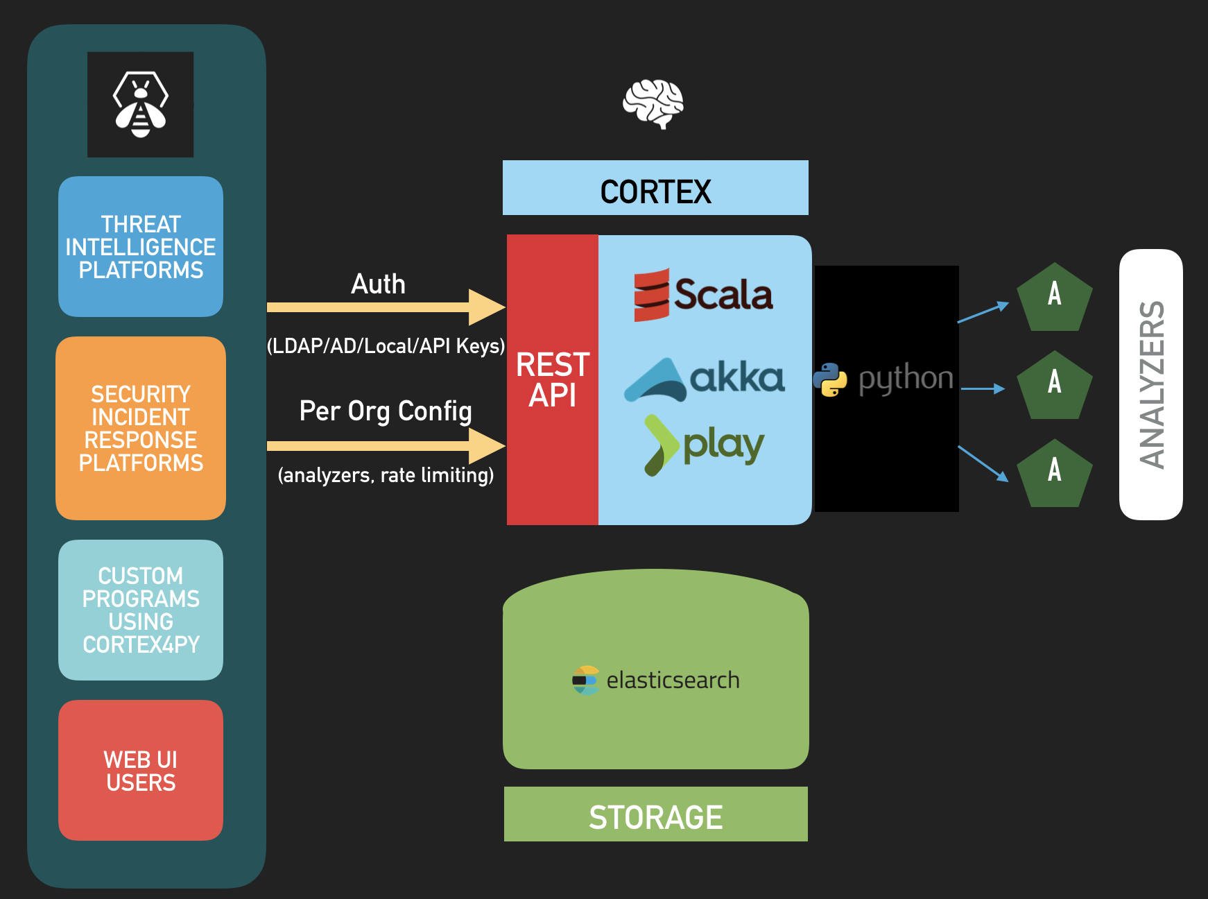 Cortex 使用 Scala 编写。前端使用 AngularJS 和 Bootstrap。其 REST API 是无状态的,这使其能够进行水平扩展。提供的分析器使用 Python 编写。可以使用相同的语言或 Linux 支持的任何其他语言编写额外的分析器。