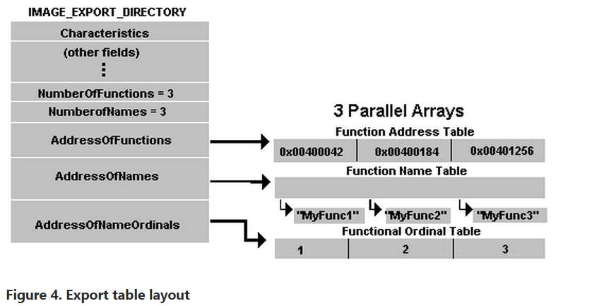 当某个进程想要使用 DLL 文件中的函数时,Windows 加载器会简单地解析此结构,并使用 `AddressOfFunctions`、`AddressOfNames`、`AddressOfNameOrdinals` 数组导入请求的函数。