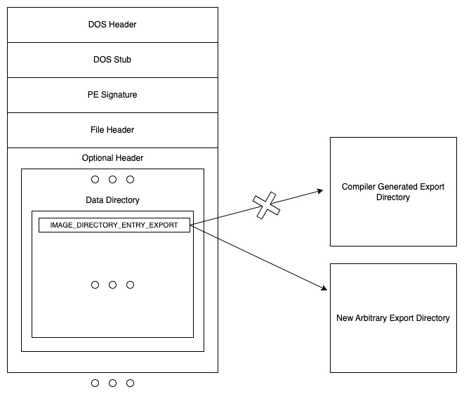 这里的关键点是,当调用 LoadLibrary 时,Windows 加载器执行的所有这些搜索和访问操作都是在 DLL 被映射到进程地址空间之后进行的。在 DLL 映射期间,整个 DLL 文件(包括其 PE 头)会被写入内存,加载器解析内存中的头以到达导出目录。这意味着如果 DLL 自身能够在附加到进程后覆盖其内存中的 PE 头,从而修改导出目录地址(简单来说,就是 `DataDirectory` 的第 0 个索引),那么加载器就会在一个任意的导出目录中查找要导入的函数,而不是编译器添加的那个。