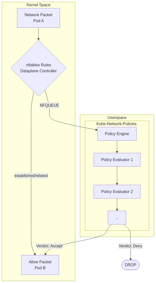 * **Dataplane Controller**:`dataplane/controller.go` 文件包含主要的 controller,它负责设置 NFQUEUE、拦截数据包并编排策略评估过程。它负责创建必要的 nftables 规则来重定向流量。为了避免将所有数据包发送到 userspace 带来的性能损失,该 controller 包含逻辑,仅捕获至少被一个 network policy 定向的 Pod 的数据包。