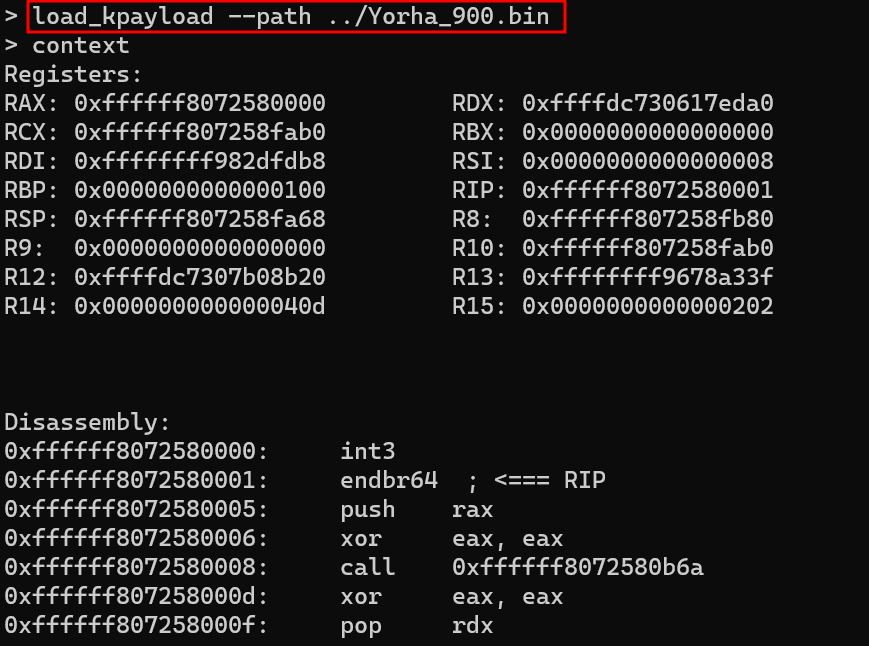 你可以使用带有 `--path` 参数的 `load_kpayload` 命令来加载内核 payload,参数需指定 payload 在磁盘上的路径。YoRHa 会加载该 payload 并在其入口点处停止,从而让你能够轻松地对其进行调试:
