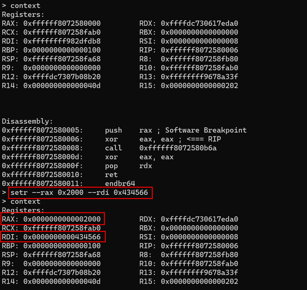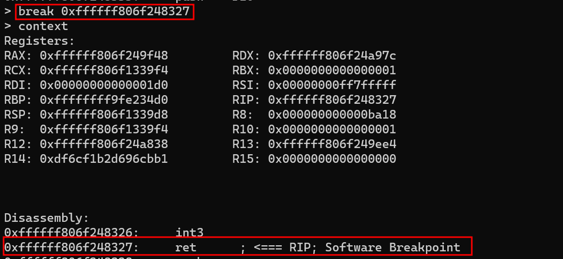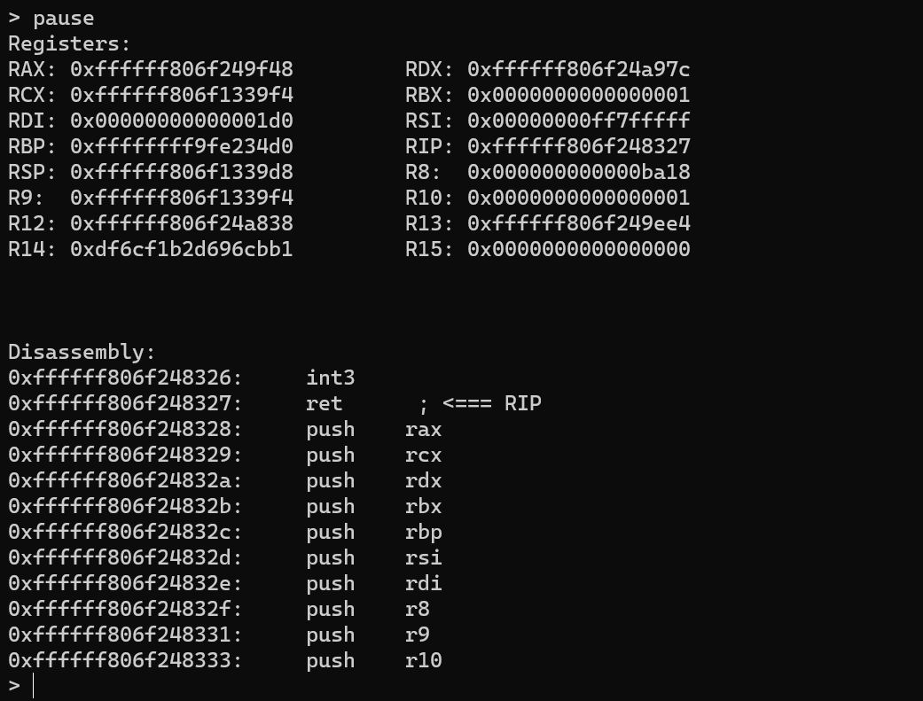 第一个实用的命令是 `pause`,它会在软件断点处将调试器陷入 trap,并将控制权转移给 trap 处理程序的 callgate。一旦调试器处于暂停状态,你就可以检查当前的线程状态、设置断点以及执行其他操作。在执行暂停命令后,它会立即在内部发出 `context` 命令。