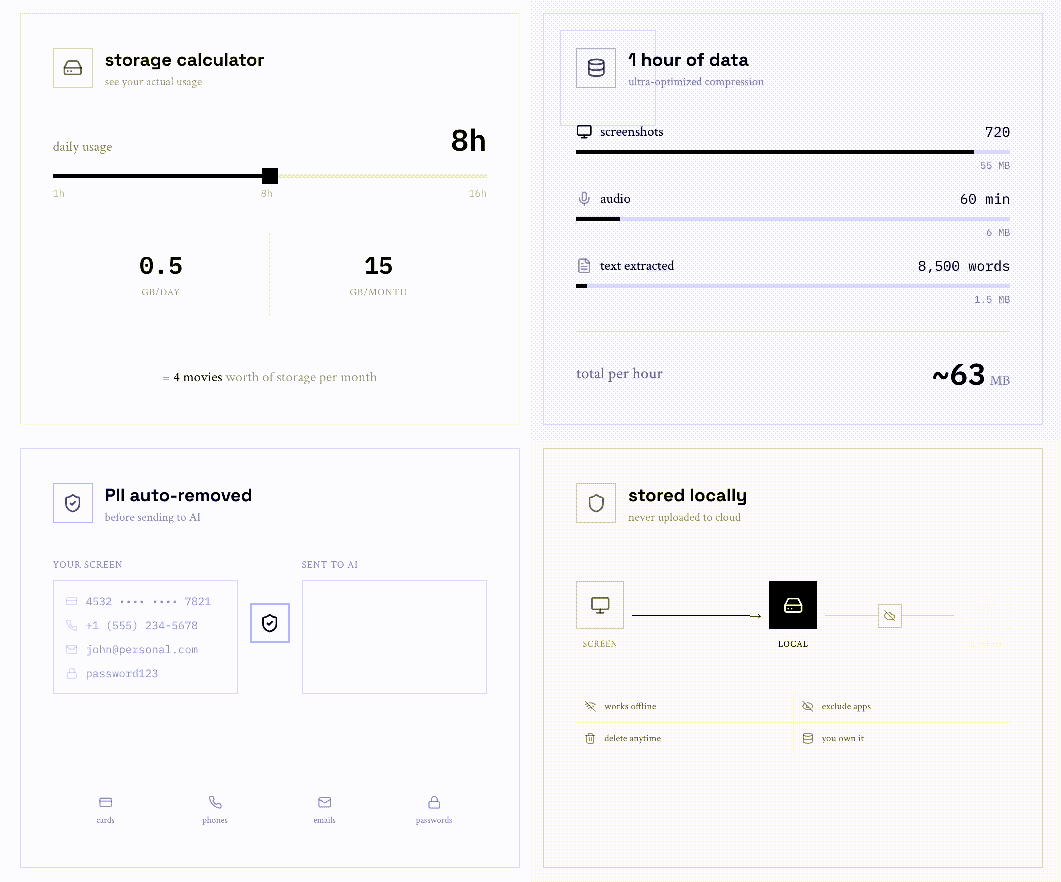 一个开源的本地屏幕与音频AI记忆工具,持续捕获电脑操作并通过自然语言搜索找回任何看过或听过的内容。