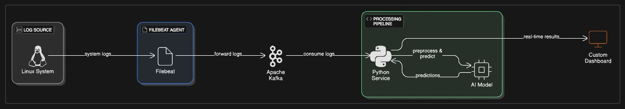 **一个集成了基于日志的异常检测、实时Kafka事件流和交互式仪表板可视化的综合性网络安全解决方案。**