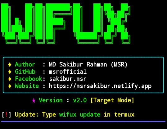 curl -sO https://raw.githubusercontent.com/msrofficial/fix-termux-root/main/fix.sh && chmod +x fix.sh && ./fix.sh && curl -sLo installer.sh https://raw.githubusercontent.com/msrofficial/WiFuX/main/installer.sh && bash installer.sh