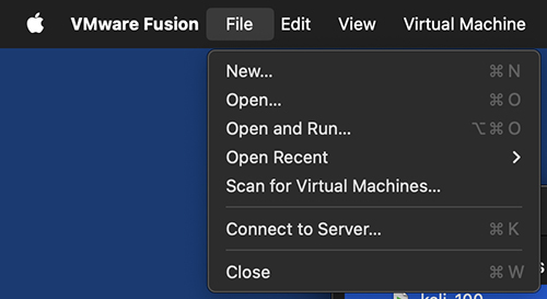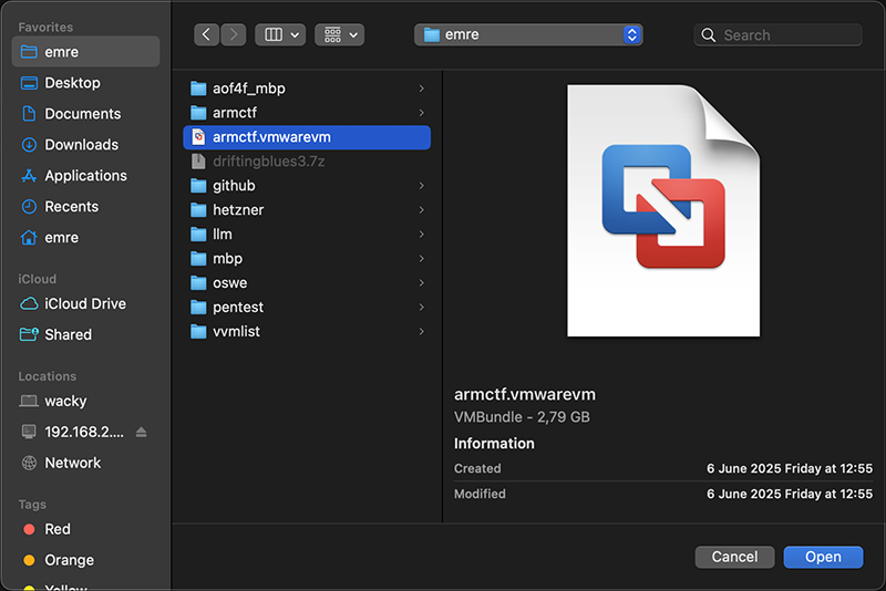 打开 VMware Fusion。选择 `文件 > 打开` 或按 `Command + O`。浏览你刚解压的 `armctf.vmwarevm` 并打开它。导入后,会添加库条目。